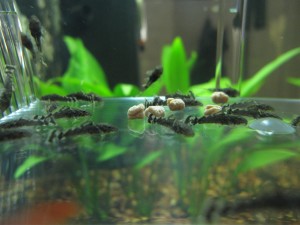 De senaste malkrabaterna har nu blivit 3 ½ veckor gamla och nu tyckte då deras föräldrar att det var dags att ge dem sällskap. Får se hur många det kommer nu. I barnkammar delen simmar ett 40 tal från förr. Denna gång är den gula klasen med ägg placerad i en liten kruka. 🙂