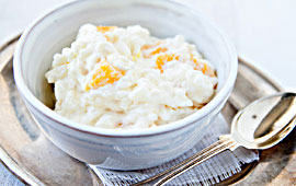 Koka riset och låt det kallna. Skala och skär apelsinerna i bitar. Vispa grädden och blanda ner den i riset tillsammans med apelsinerna. Tillsätt strösocker och vaniljsocker efter smak. Låt stå kallt en god stund innan servering.